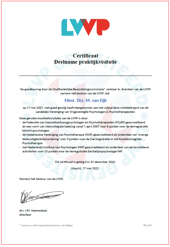 De Praktijk voor Psychotherapie is een gevisiteerde praktijk die voldoet aan de kwaliteitseisen van de (specialistische) vakverenigingen.
